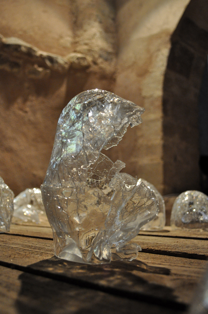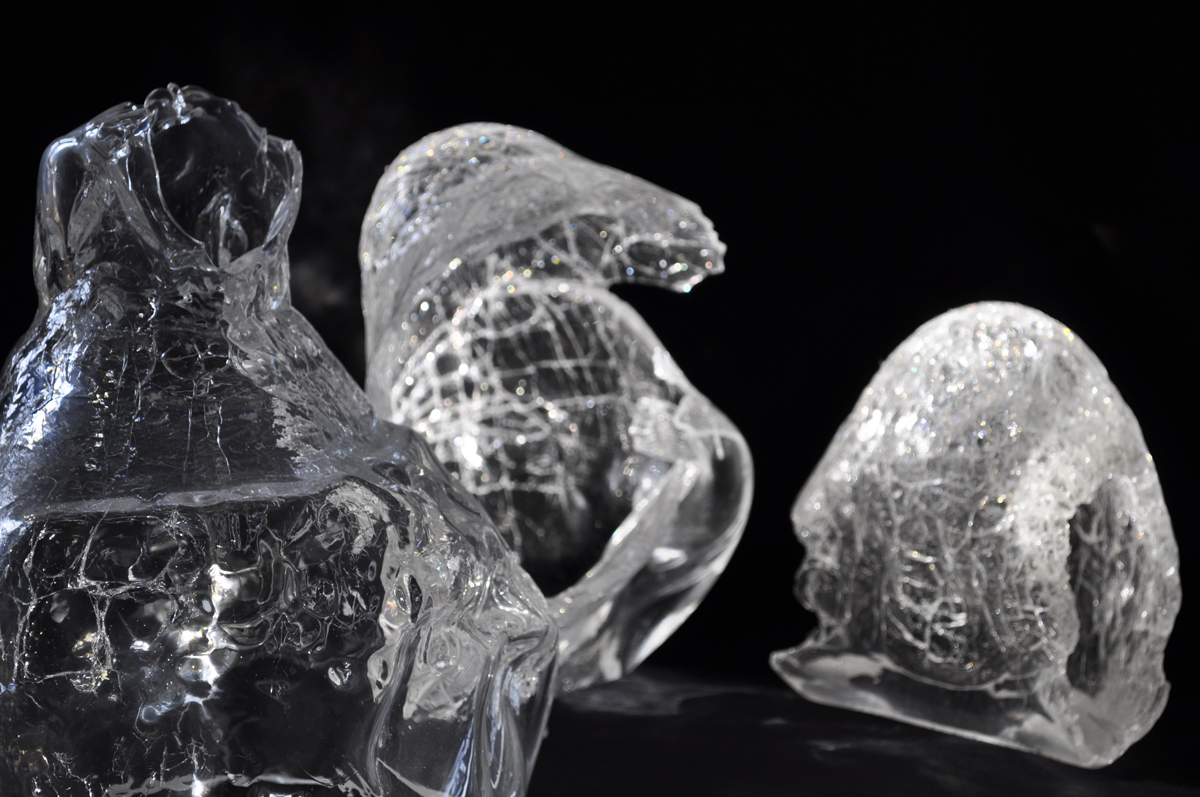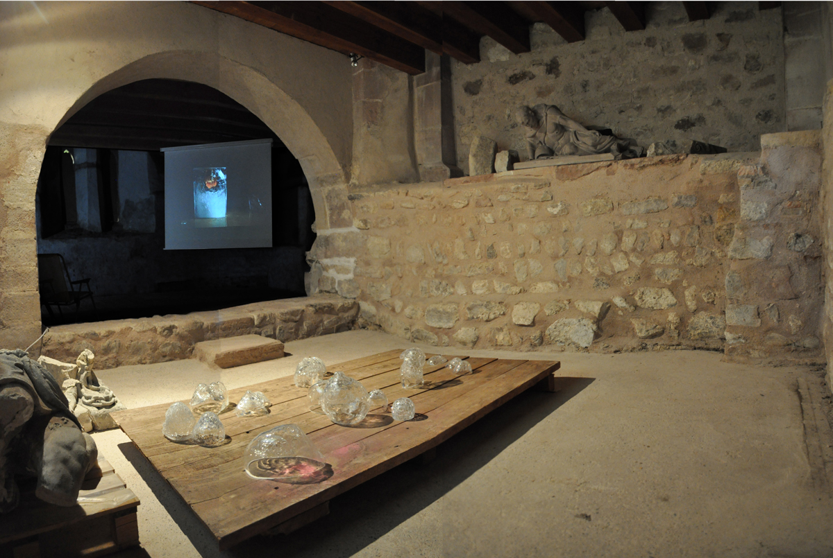 Sylvie de Meurville, curator: Mathilde Caylou chose a roc in the Vosges: the sandstone which used to carry a glacier; she molded it and then molded the mold to be able to poor water in it and create its replica in ice. she has blown crystal in this mold that is shaped like a little hollow stone. The thermic shock she provoked through the contact of the glass in fusion with the ice at around 1100°C (2012 Fahrenheit) is spectacular, as the video shows. The pieces that were created one after the other until the mold was completely destroyed, bear the trace of this violence which links with the telluric quality of the original roc. The ice and the glass tear one another apart in different ways, but only the crystal can materialize the memory of their fight; the memory of the ice fades away quickly, and needs to be recorded on video to be preserved. The artist breathed life into the original encounter between the elements, the traces of which draw the landscape of the Vosges Mountains.