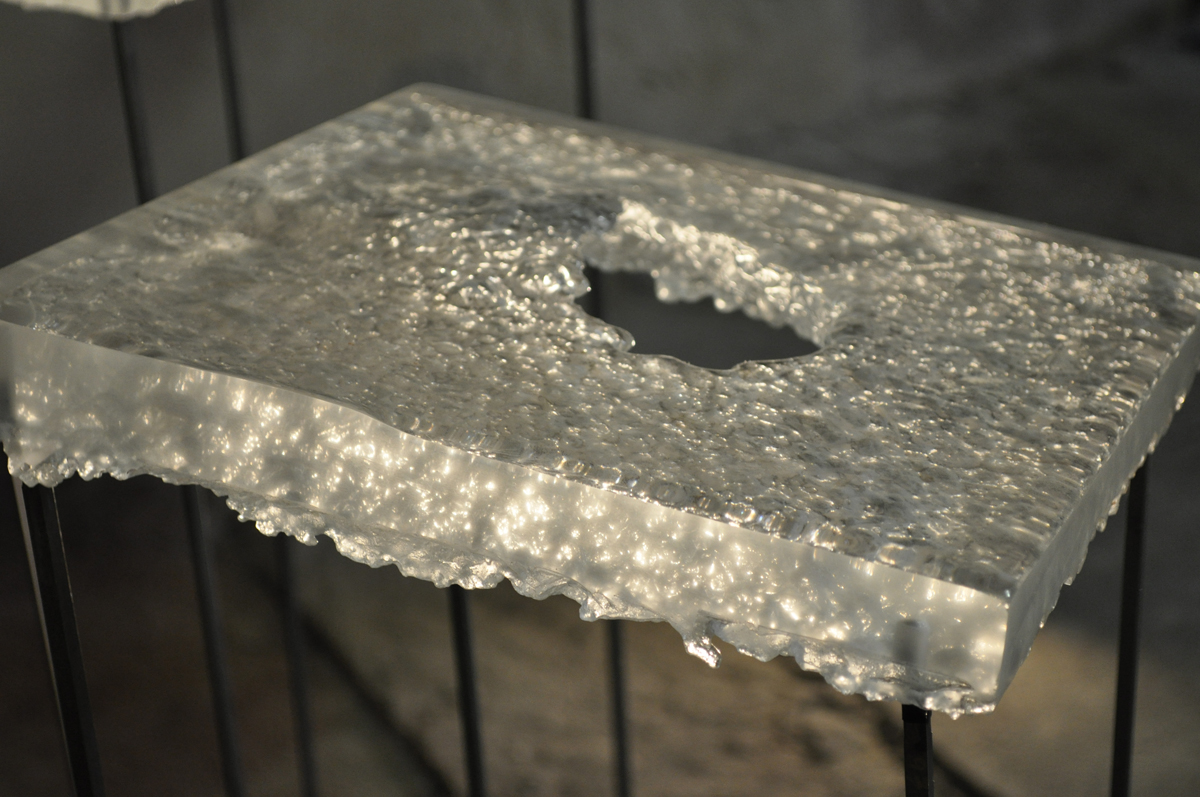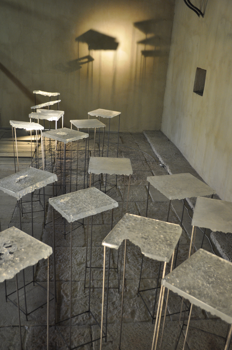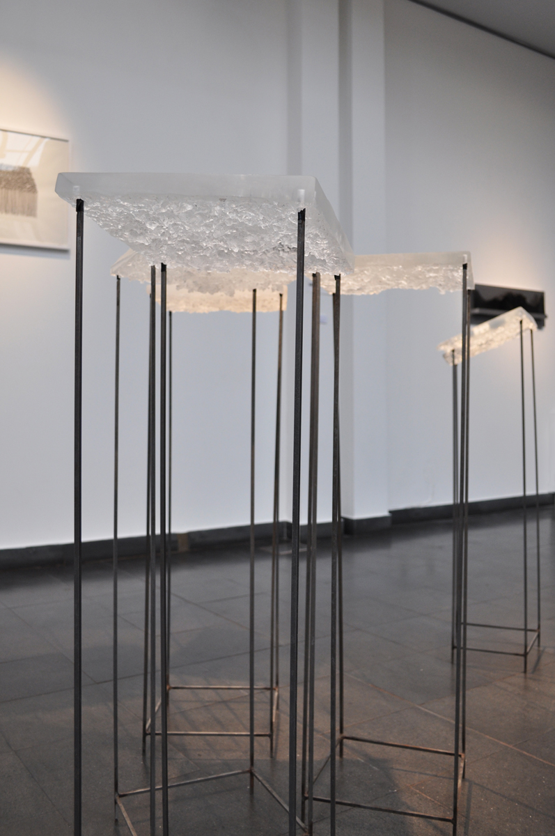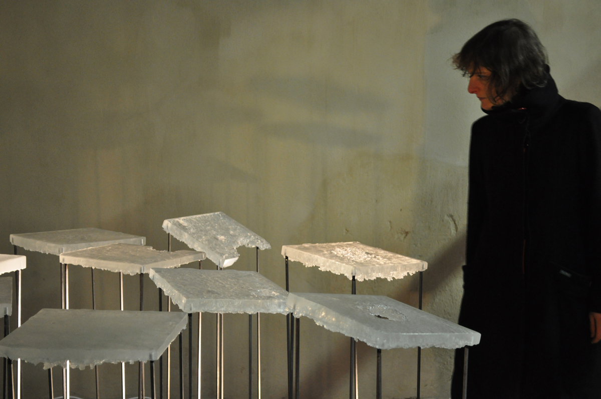 Like the ocean tides, terrestrial tides are a physical phenomenon created by gravitational forces. The continental slabs that float on magma are subjected to the pressure of the water, the atmosphere, the attraction between the Sun and the Moon. Some slabs are open, the glass, the liquid hasn’t covered the relief of the mold. Like the water that laps against the coasts and lets the tectonic slabs emerge. The installation represents a constellation of places that float in the air, adrift.