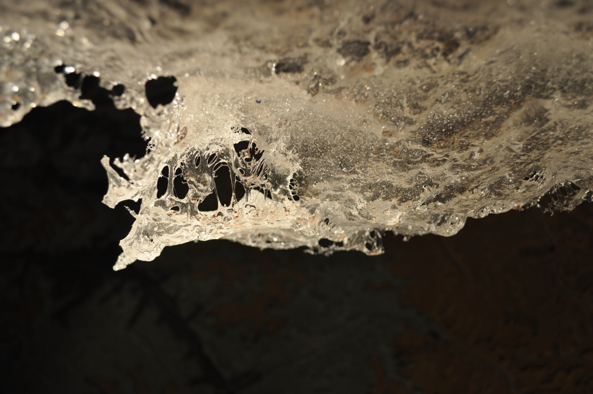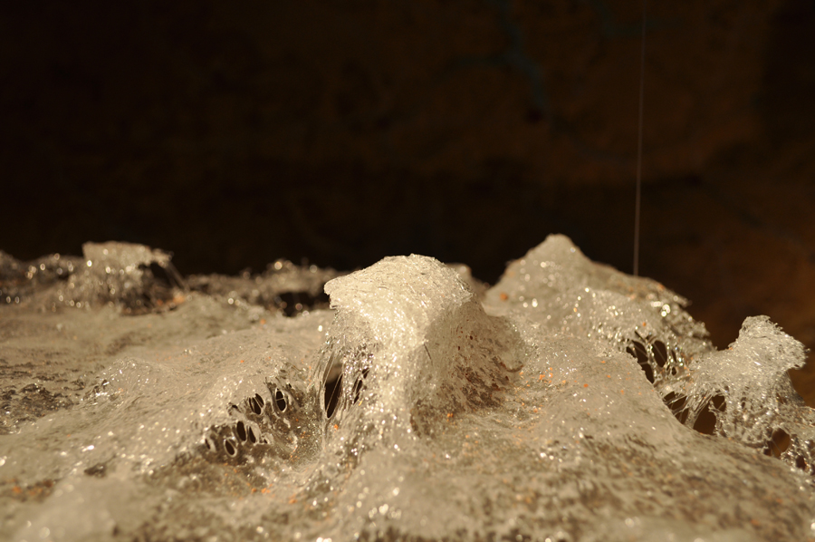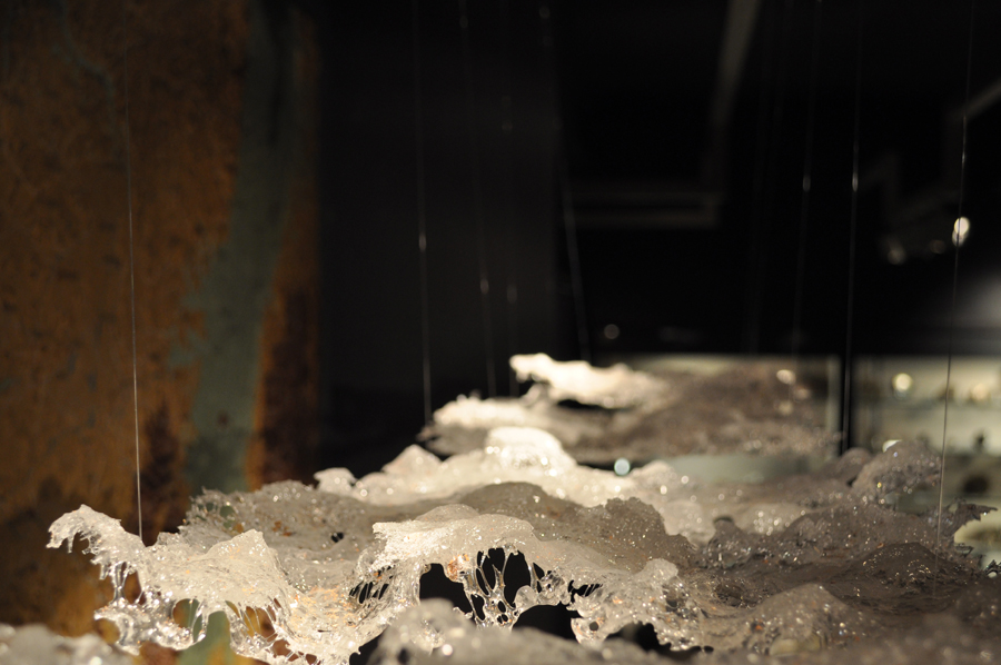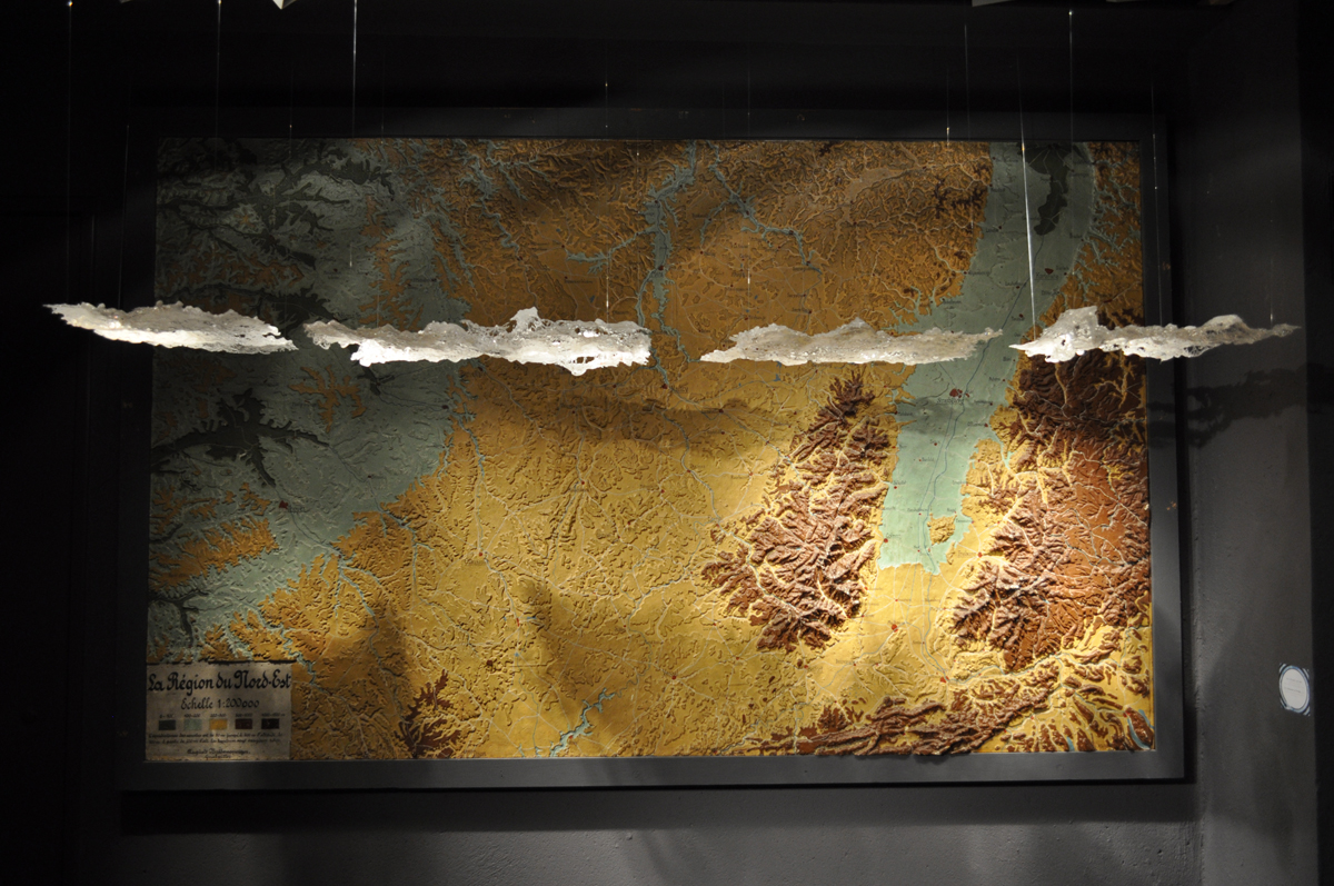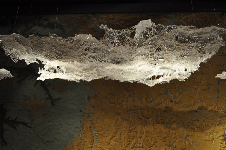 Brins de cristal thermoformés sur un moule de sol correspondant à la carte des gisements d’argiles en arrière-plan. Musée Théodore Deck, Guebwiller