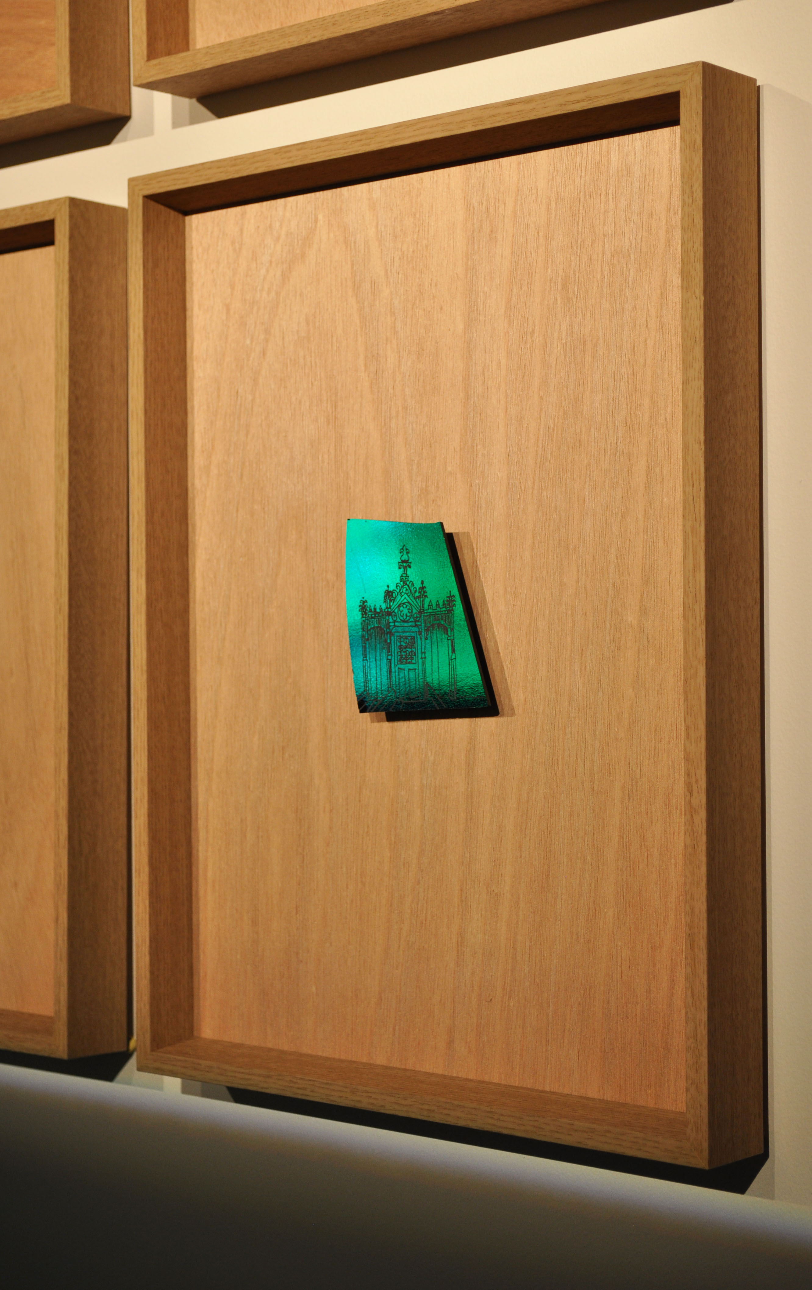 Des croquis réalisés dans différents édifices religieux d’Angers (église Ste Thérèse, abbaye du Ronceray, église de la Trinité) sont gravés à la surface du verre. Les cadrages sont focalisés sur des éléments de décors arborant le motif du végétal. Eclairés par une forte lumière, ils projettent des tâches colorées sur le mur rappelant la lumière diffusée via les vitraux des églises.