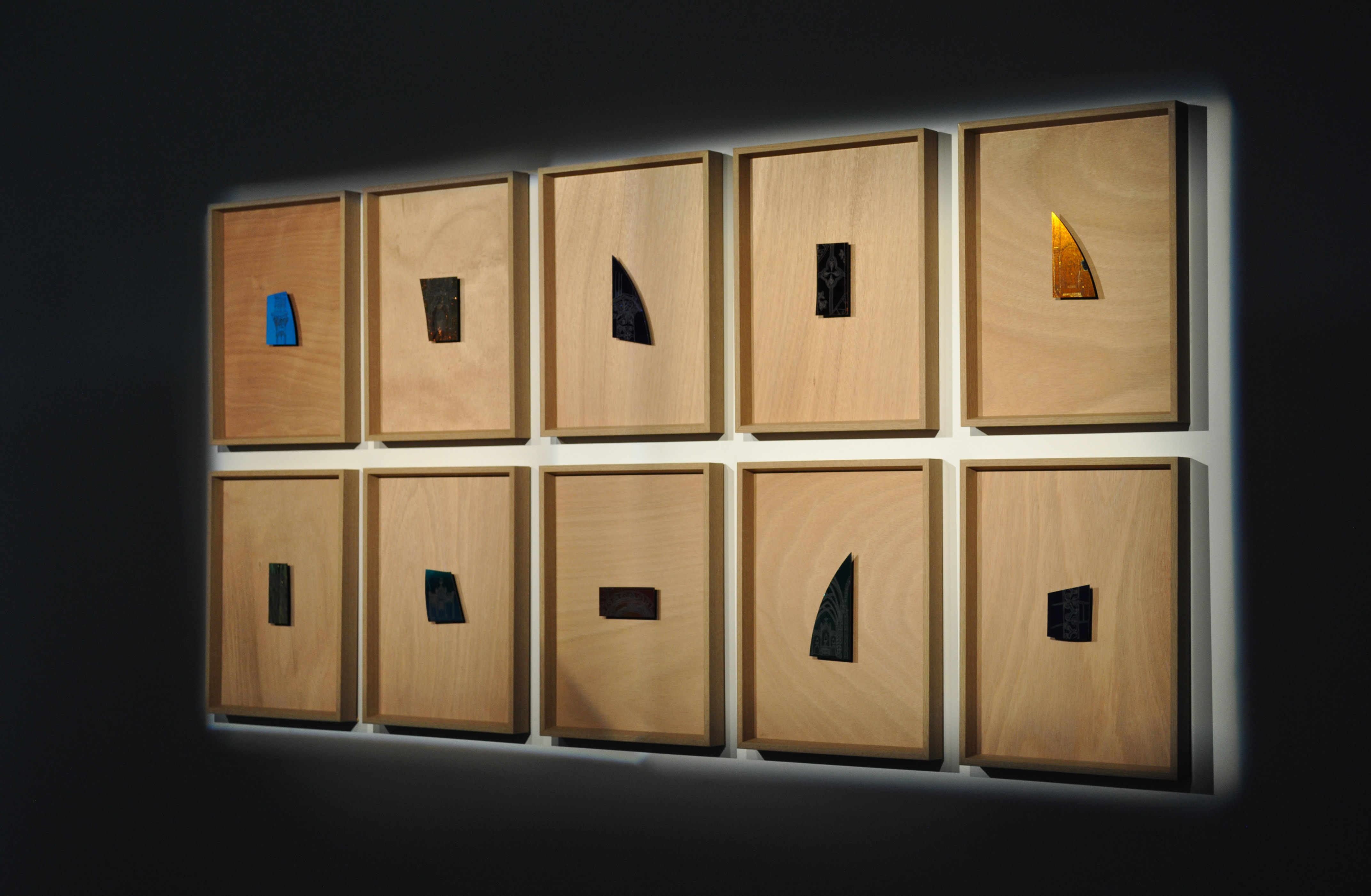 Sketches made in various religious buildings in Angers (Ste Thérèse church, Ronceray abbey, Trinité church) are engraved on the surface of the glass. The framing is focused on decorative elements featuring the plant motif. Illuminated by a strong light, they project colored spots on the wall, reminiscent of the light diffused through stained-glass windows in churches.
