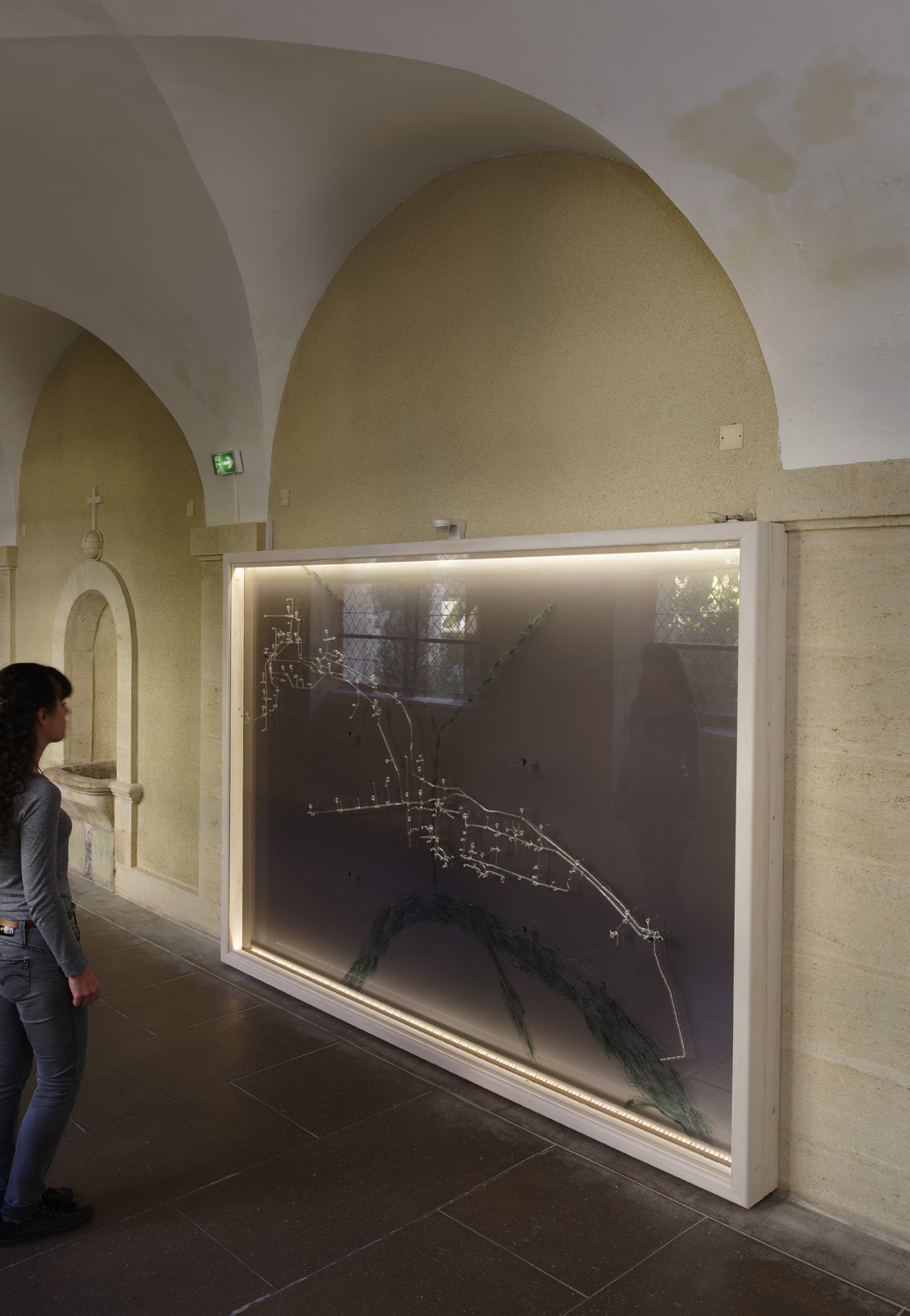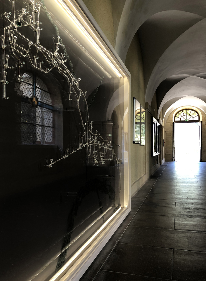 The Vauclaire hospital has its own water network. This network is like the skeleton of this living place. The map was recreated with glass which provides it with a certain fragility, delicacy, preciousness. It is attached vertically to the wall with magnets, and seems to precariously float on top of a grey and transparent stand which reminds us of X-rays. Two maps overlap in this sculpture. In the foreground, we see the water network of the hospital, as it has been drawn, organized and channeled by men. In the background, we discover the organic, irregular watercourse of the river. These two elements interact, they live together, but one depends on the other. The hospital is porous, it protects and attempts to prepare patients from/for the world outside