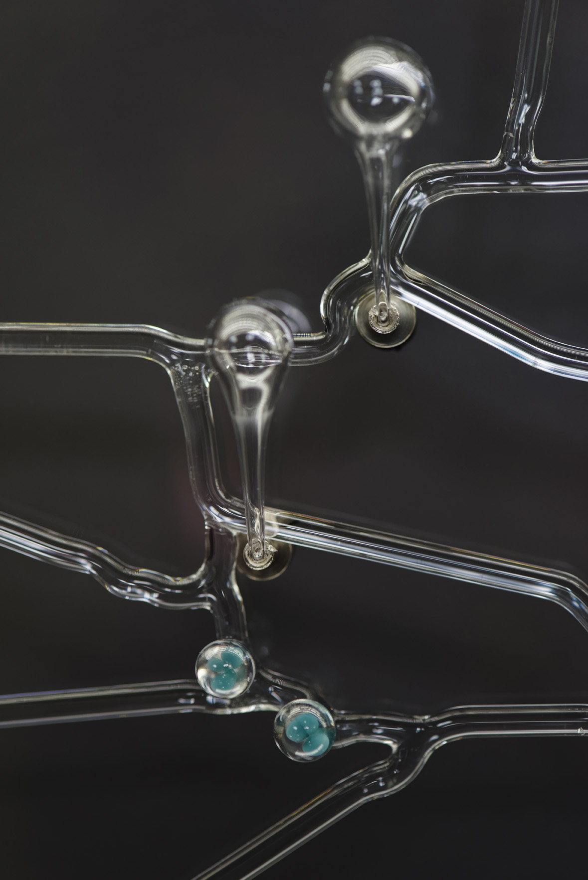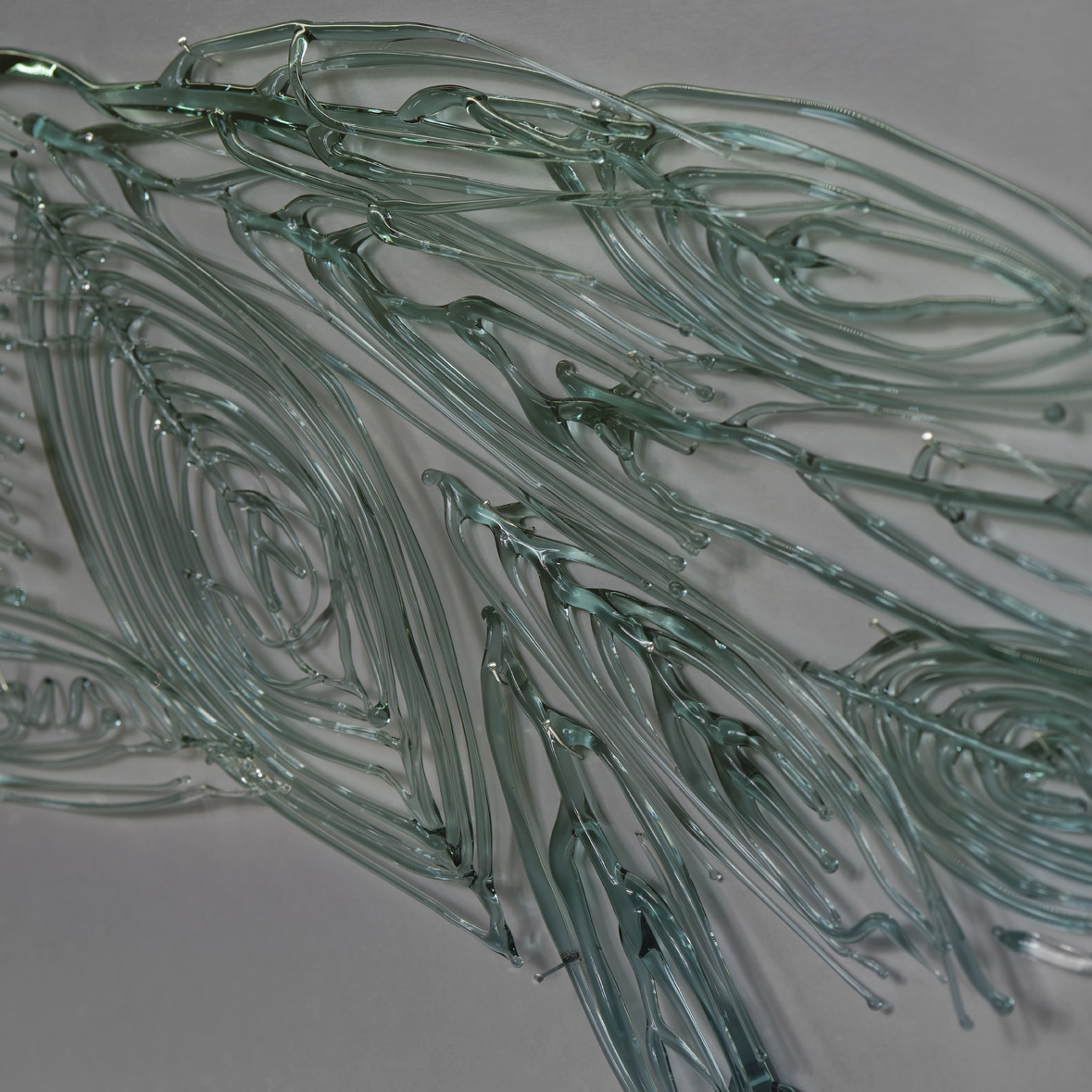 Œuvre réalisée dans le cadre des « Résidences de l’Art en Dordogne », programme coordonné par l’Agence culturelle départementale Dordogne-Périgord. Artiste accueillie en résidence de création en 2018 au CHS Vauclaire en partenariat avec l’association Zap’art et l’Agence culturelle départementale dans le cadre des « Résidences de l’Art en Dordogne ». "Le fait que l’hôpital soit autonome en eau m’est apparu très intéressant, et a rejoint mes premières réflexions sur le lieu. Les différents châteaux d’eau qui ponctuent le paysage de l’hôpital me sont apparus comme des points névralgiques dans l’organisation de la vie. Le verre et l’eau ayant des similitudes plastiques et physiques, les connexions étaient là. De là est partie l’idée de travailler sur le réseau d’eau de l’hôpital, comme le squelette de ce lieu de vie. Le plan est recréé en verre, ce qui lui donne une certaine fragilité, délicatesse, préciosité. Il est fixé à la verticale par des aimants, et flotte sur une apparente précarité. Il est installé sur un support transparent, grisé, qui rappelle les radiographies. Deux plans se superposent dans cette sculpture. Au premier plan, le réseau d’eau de l’hôpital, tracé de la main de l’homme, organisé, canalisé. Au second plan, le tracé de la rivière, organique, courbe, irrégulier. Ces deux éléments interagissent ensemble. Ils cohabitent, l’un est dépendant de l’autre. L’hôpital est poreux, il protège les patients du « dehors » en canalisant leurs troubles, tout en essayant de les y réadapter." Acquisition de l’œuvre par le Centre Hospitalier Vauclaire. Crédit photo Jonathan Barbot