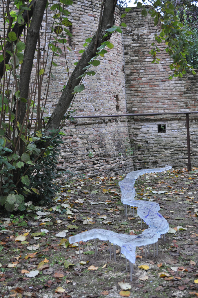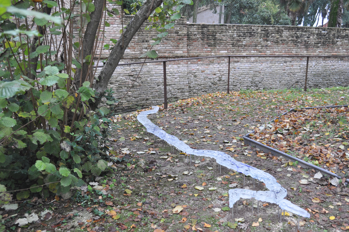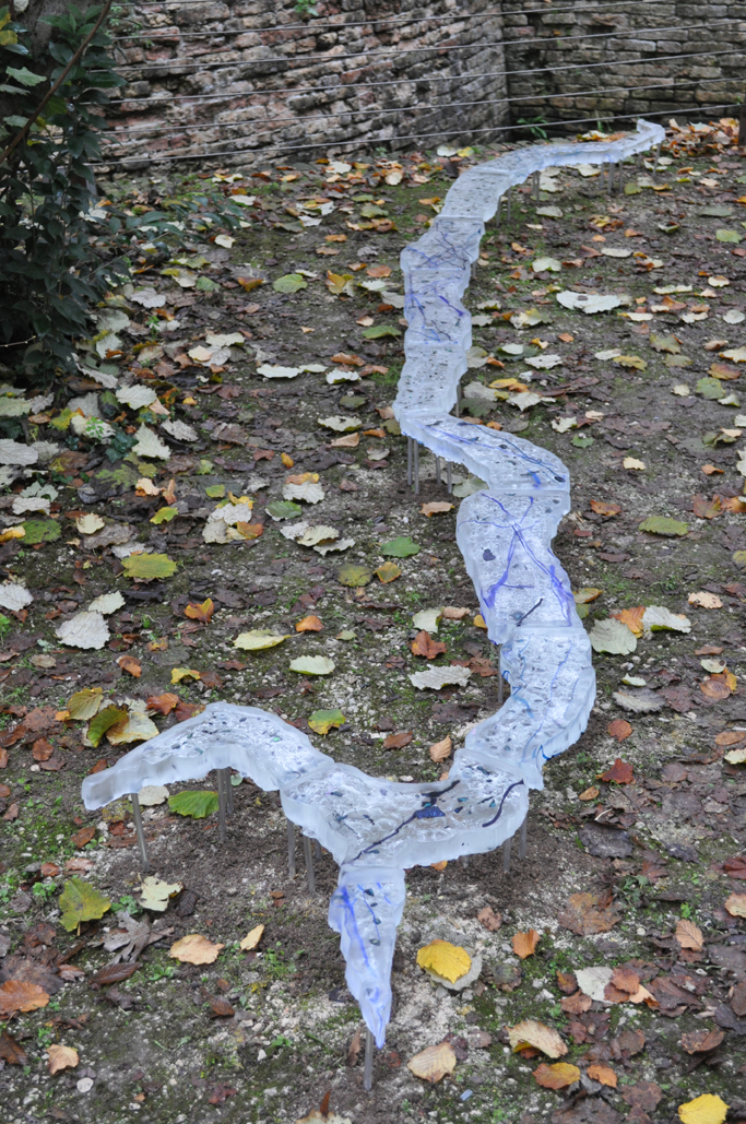 Le Tagliamento est un fleuve sauvage et non canalisé, descendant des glaciers alpins. Pour cette commande de la ville de San Vito al Taglaimento, j'ai recrée ce fleuve en verre, en suivant son dessin via vues satellites.