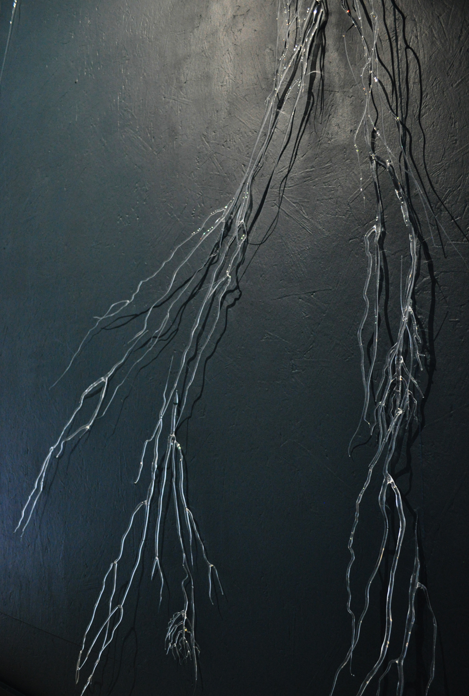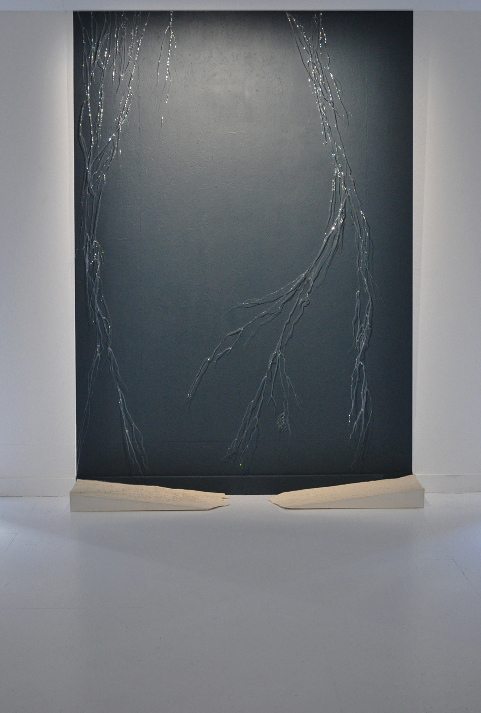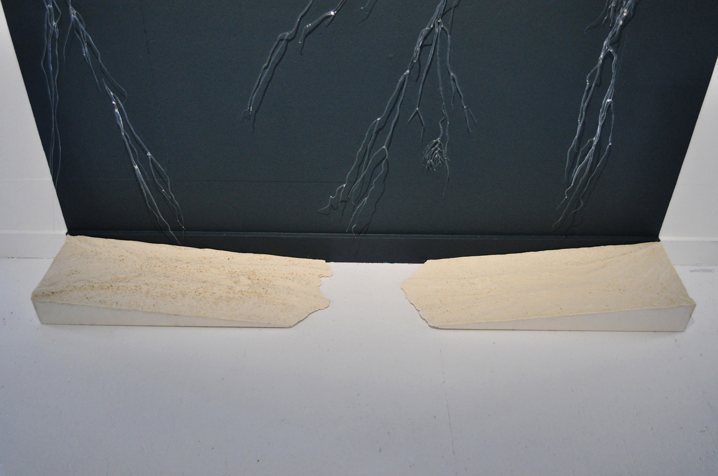 Avec « Bassin versant », Mathilde Caylou imagine une installation dans laquelle le verre se fond encore et toujours plus avec la végétation et l’eau, les traces de son passage sur le sol, à la façon dont ils s’entremêlent dans le paysage qu’elle découvre. Eric Sébastien Faure-Lagorce