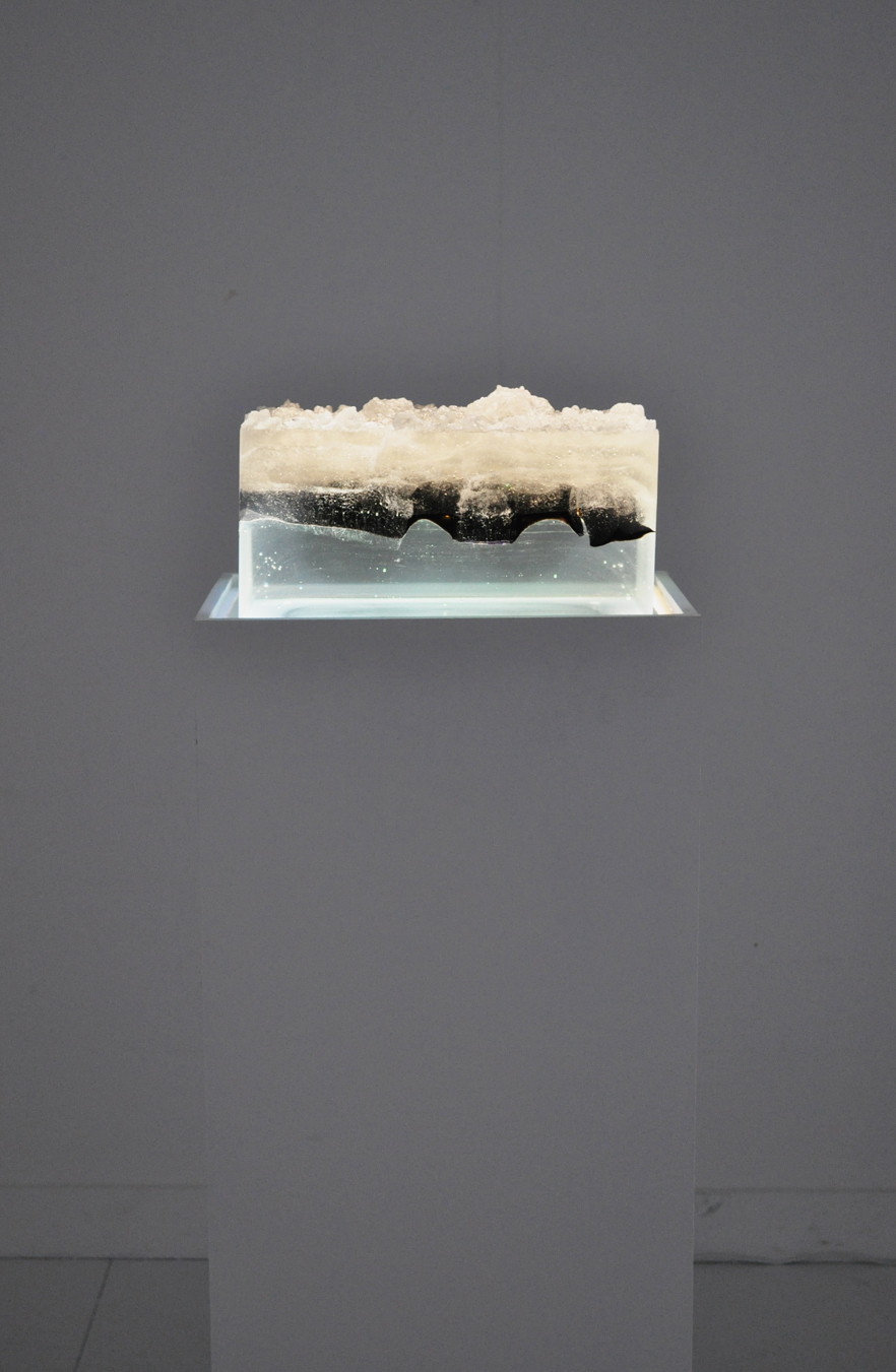 « Tourbière » est une oeuvre caractéristique de son protocole de création. Elle enferme néanmoins une approche technique complexe et un matériau nouveau dont l’utilisation a été induite par ce phénomène aperçu à la surface du sol vendéen. Grâce à une prise d’empreinte, réalisée au moyen d’une couche de plâtre déposée à même la terre, elle vient en capturer les aspérités. Puis, elle les transpose en un bloc de verre d’une vingtaine de kilos, fondu selon une technique de moulage du verre : le casting. L’apparence de l’oeuvre évoque autant une coupe géologique que l’imagerie médicale et traduit le souhait de l’artiste de révéler ce que la terre ne laisse voir : les différentes strates du sol et son process de transformation. Son aspect massif vient par ailleurs accentuer la pesanteur de la matière et du temps, son propos sur la formation de la tourbe non pas par le parcours et la trajectoire de l’eau, mais par son inertie. En transparence, derrière ses parois délicatement polies à l’eau et au carborundum, de multiples couches se distinguent et le regard peut ainsi pénétrer dans les profondeurs du sous-sol, découvrir cette matière organique fossile formée par accumulation. Eric Sébastien Faure-Lagorce