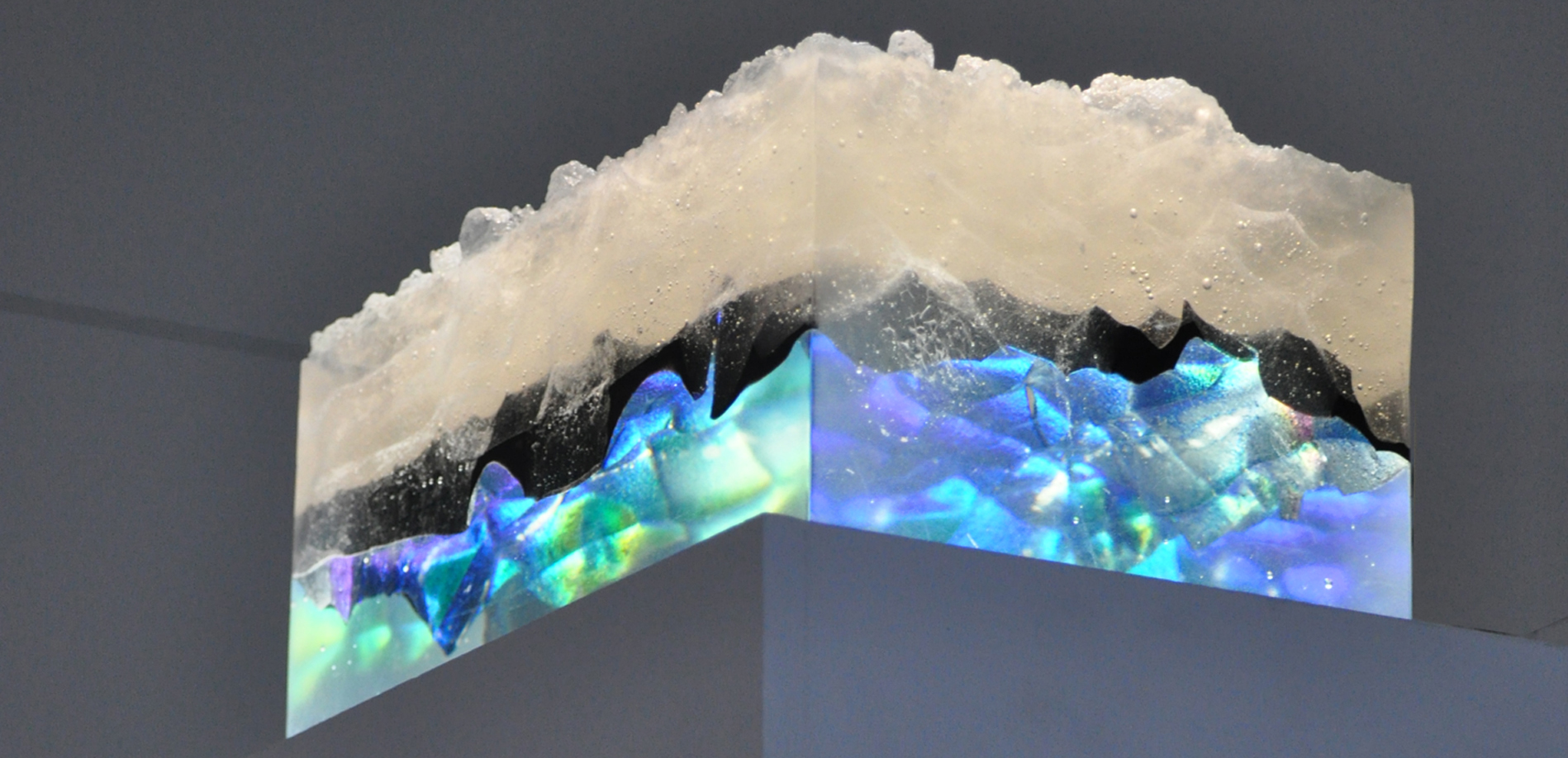 “Peatland” is a unique piece, made during an artist residency in Vendée, France. I worked on the place where I was. I was living close from a peatland, a wetland area protected. Plant elements and organic matter that have fallen to the ground and accumulated are decomposed little or no, because of the permanent immersion. Sometimes this laborious and difficult decomposition reveals iridescent traces. To account for this place, I molded the surface of the ground. As a geological section, we can see in levitation a dichroic glass layer that evokes this plant decomposition. In transparency, behind its walls delicately polished with water and carborundum, multiple layers are distinguished and the look can penetrate the depths from the subsoil, discover this fossil organic matter formed by accumulation. It also directs attention to the in-between state of the plant: between the living and the inert, between the solid and the liquid, between the water and the soil.