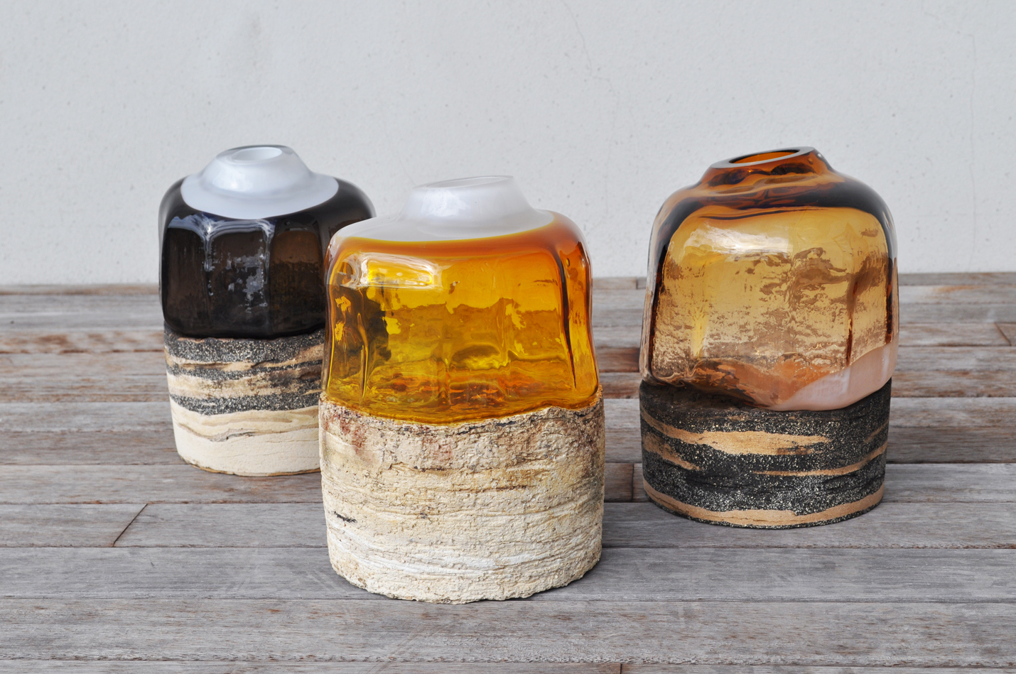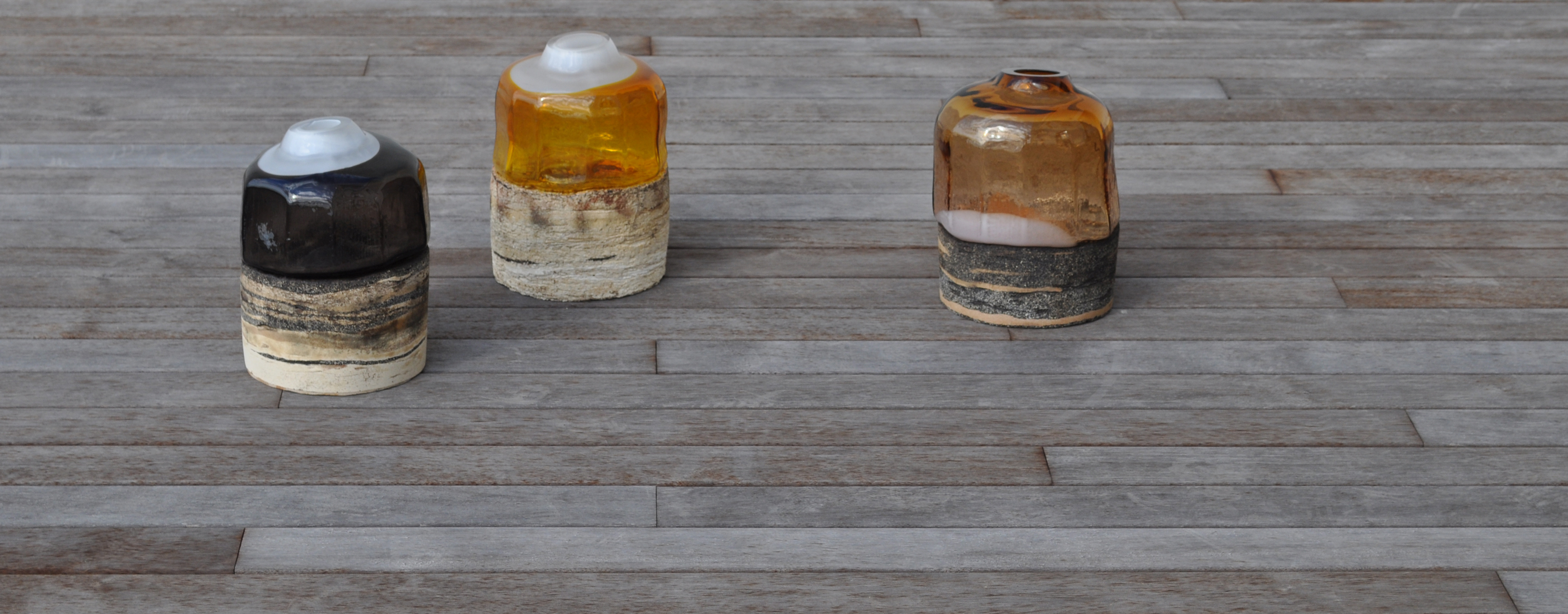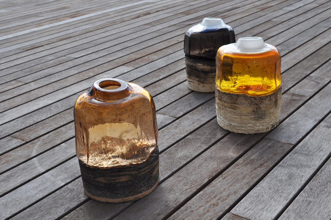 The ceramic base is cylindrical and represents a core, geological cut. Lands of different compositions and colours evoke the strata of the basement. The upper part of the carrots bear the footprint of the soil of vineyards. On these carrots glass is blown. The pieces are blown into a mould made with old staves used in the manufacture of Martell cognac. The coloured glass reproduces the warm hues of cognac. The white upper part evokes evaporation of the alcolhool. The glass keeps track of the wood of the staves and the relief of the ground.