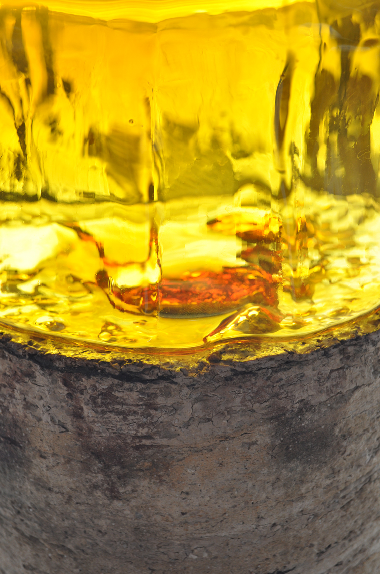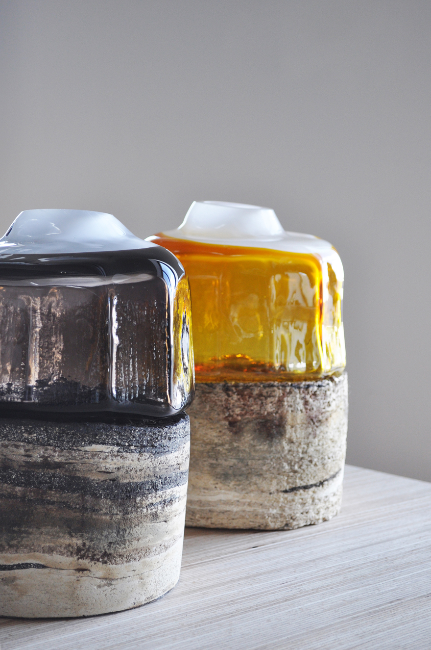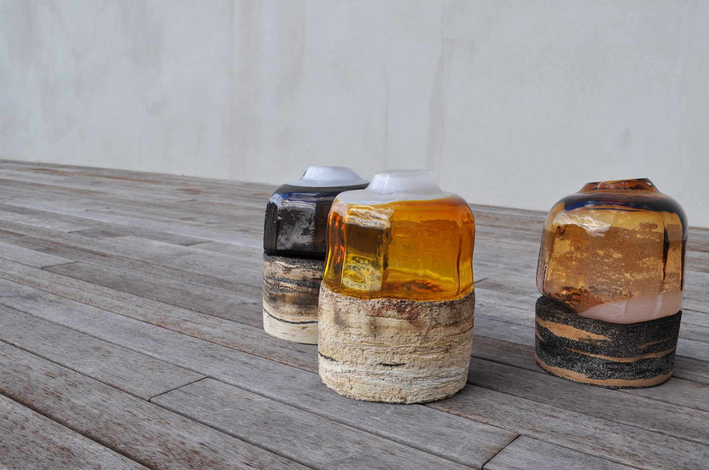 The ceramic base is cylindrical and represents a core, geological cut. Lands of different compositions and colours evoke the strata of the basement. The upper part of the carrots bear the footprint of the soil of vineyards. On these carrots glass is blown. The pieces are blown into a mould made with old staves used in the manufacture of Martell cognac. The coloured glass reproduces the warm hues of cognac. The white upper part evokes evaporation of the alcolhool. The glass keeps track of the wood of the staves and the relief of the ground.