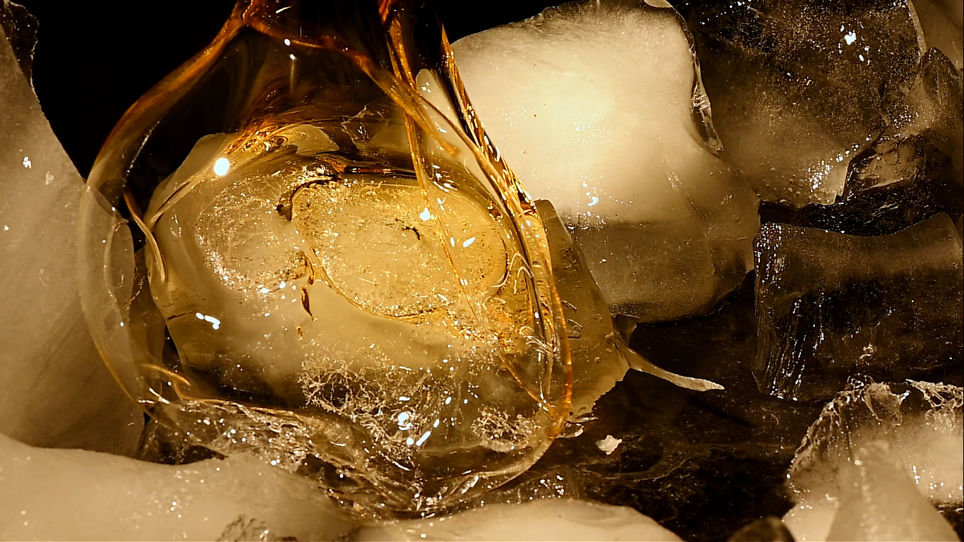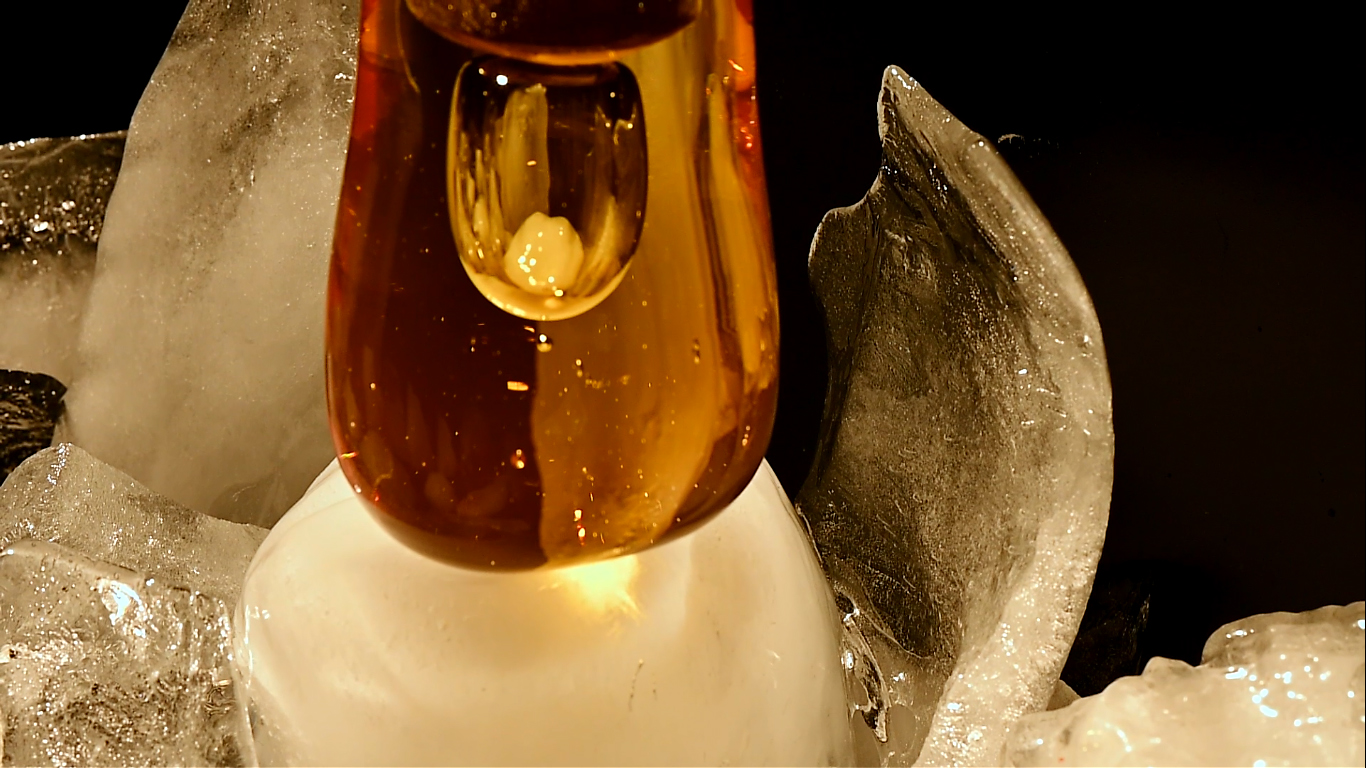 Un ensemble de rochers en glace dessinent un paysage gelé. Au contact du verre chaud un choc thermique se produit de quelques 1000 degrès. La glace fond, le verre craque. La confrontation est spectaculaire, le verre porte son empreinte, le caractère tellurique de la roche. Les matériaux réagissent à la limite de leurs capacités. Image: Martyna Pawlak Son: Etienne Caylou Film réalisé avec le soutien de la Fondation d'Entreprise Martell