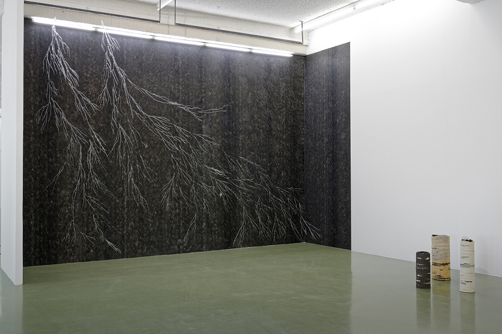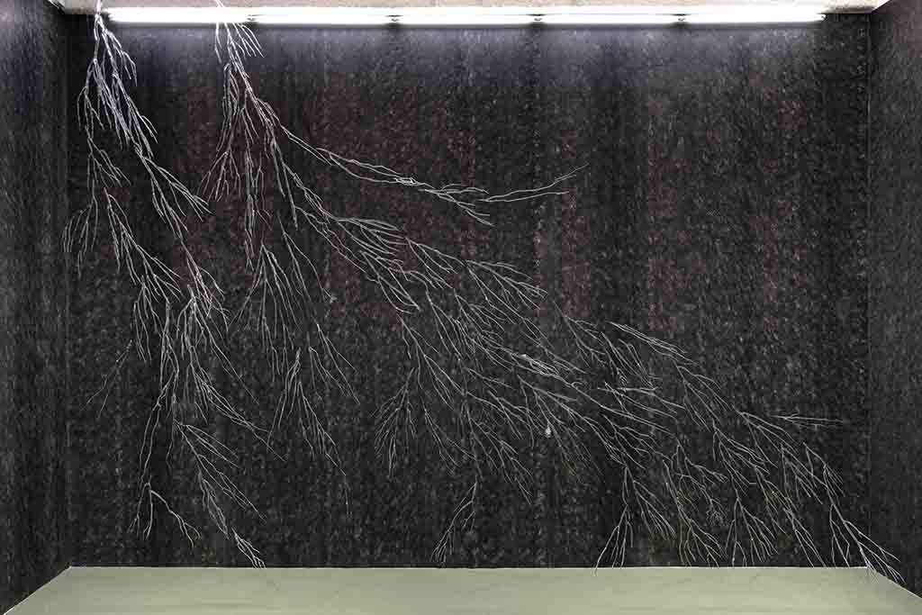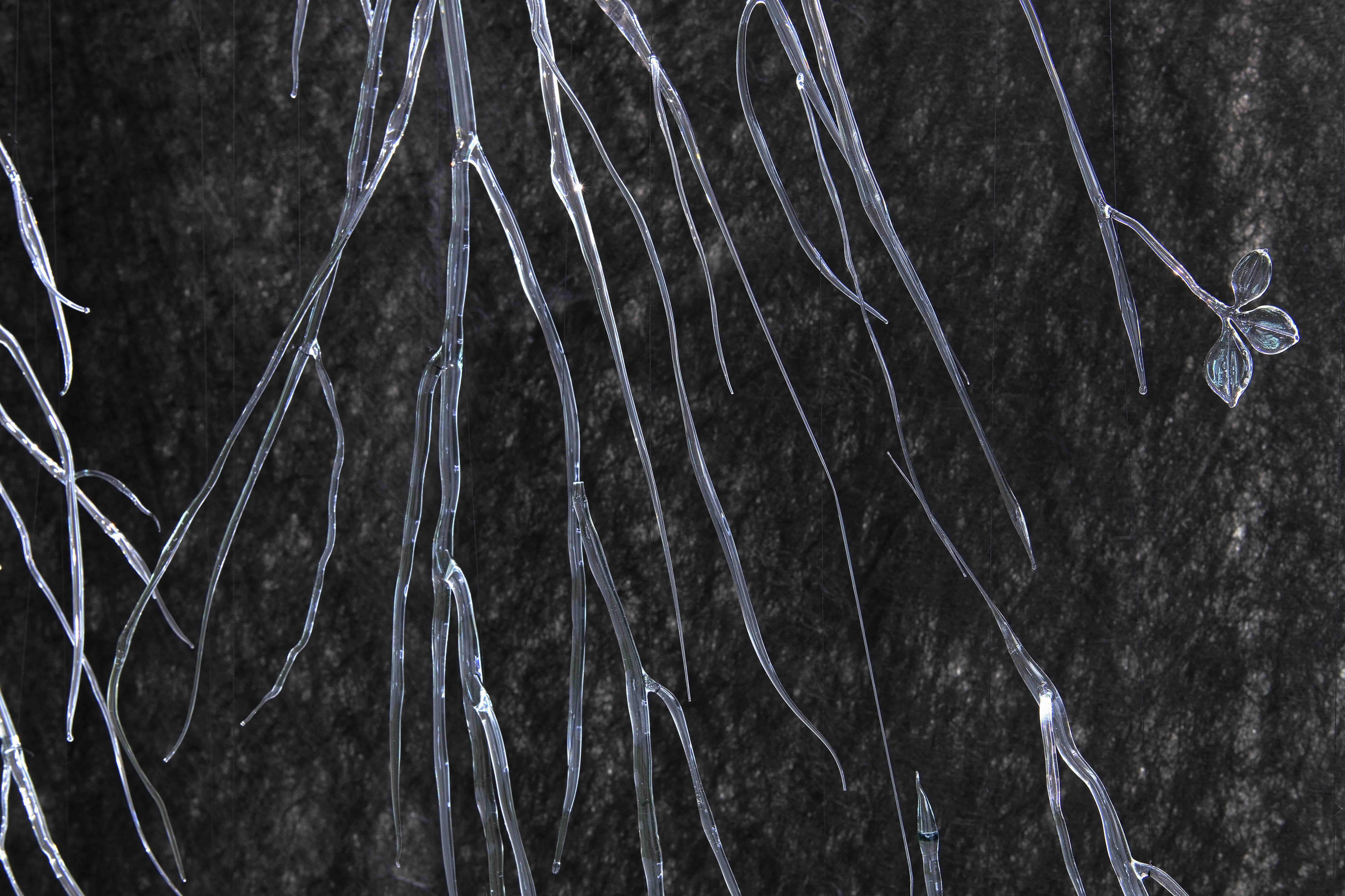 Chevelu Racinaire is a large network of glass roots. Descending from the ceiling, they stand out from a black geotextile background. This geotextile, fibrous, really reminds of hair. This network also refers, through the transparency of the glass, to networks of underground water veins. This work invites to a descent into the basement.