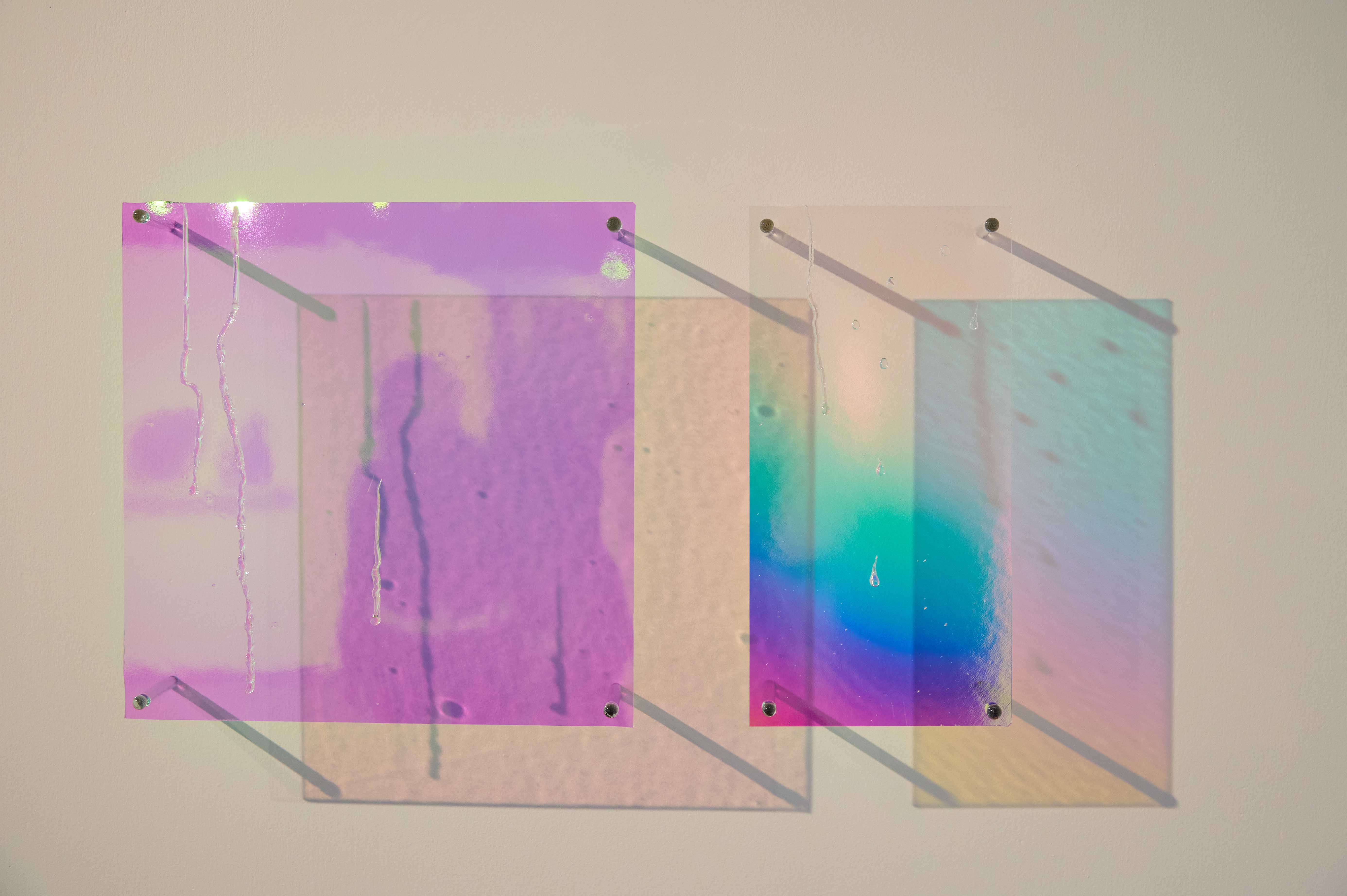 spun glass, dichroic glass, spacer in glass 36 x 36 x 7 cm 36 x 17 x 7 cm