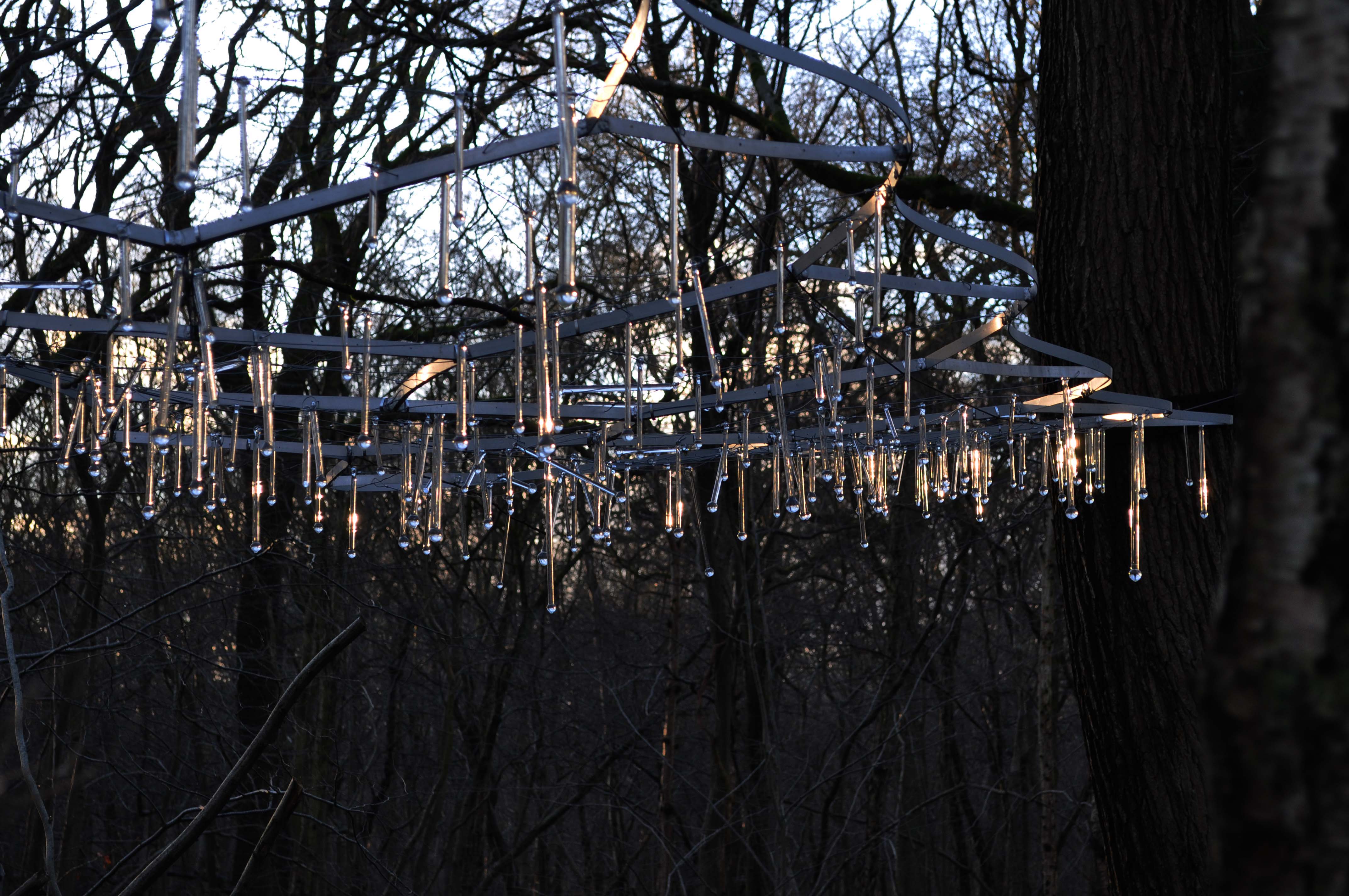 1150 gouttes de verre, câbles métalliques, structure en aluminium 40 m2 suspendus dans les arbres